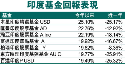 以佔今年來榜首的木星印度精選基金為例,主要是透過印度次大陸及區域內鄰近國家股票管理組合,以達致長期資本增值目標。