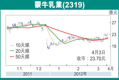 民企洗倉潮雖令投資者卻步,不過另一方面則有利資金換馬流入實力股,尤其是一些前期曾被拋售的行業龍頭股,蒙牛乳業(2319)便為其中一隻。去年底蒙牛其中一款牛奶被驗出可致癌毒素黃曲霉素超標,令銷情受到一定的影響,也導致股價受壓。不過有跡象顯示,上述不利影響已漸告淡化,觀乎今年首季蒙牛銷售已錄得按年增長(顯著優於市場原預期負增長約10%),加上集團已加大促銷,而旗下高端產品如特侖蘇銷情依然理想,都令其未來銷售收入及純利前景備受看好,預計其股價後市回升的空間仍在。
