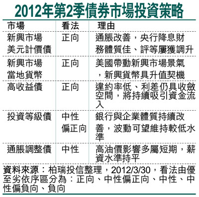 柏瑞新興市場企業策略債券基金經理人許家禎認為,雖然中東情勢仍時常干擾市場走勢,但因目前美歐各國長期採低利率政策下,各主要國家包括中印、亞洲、美國等市場通脹壓力仍在低檔,形成債券漲升的溫床;相較於股票波動度,債券更適合想參與投資新興市場的穩健型投資者,不過正確的操作策略及適當的配置策略則更顯重要。