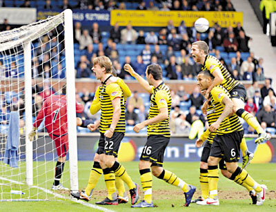 昨晚蘇格蘭超級聯賽只需在主隊基爾馬諾克身上多取1分便可提早5周封王的些路迪(黃衣),結果大勝6:0,全取3分,重奪失落3個球季的聯賽錦標。 ■路透社