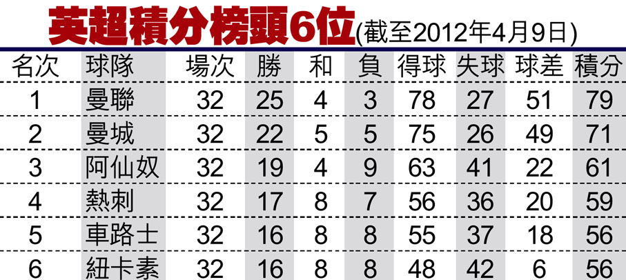 英超積分榜頭6位(截至2012年4月9日) (2012-04-10) (圖)