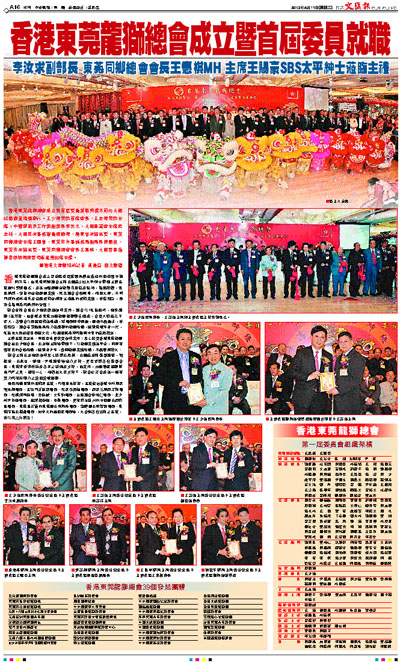 香港東莞龍獅總會成立暨首屆委員就職典禮在莊嚴的國歌聲中揭開序幕,由東莞同鄉總會主席王賜豪SBS太平紳士帶領主禮嘉賓進行剪綵儀式,及為18頭醒獅金龍簪花掛紅及點睛,場面壯觀,氣氛熱烈,緊接的金龍醒獅表演,寓意總會會務興隆,鴻圖大展;不同門派的武林精英及亞運武術金牌得主精湛的武術表演,技驚四座,博得全場喝彩和熱烈的掌聲!