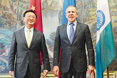 ■楊潔篪(左)和拉夫羅夫(右)出席中俄印外長會議。 法新社