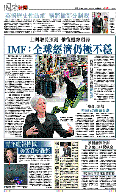 國際貨幣基金組織(IMF)總裁拉加德前日警告,全球經濟形勢雖有所改善,但復甦勢頭依然脆弱,前路仍風險重重,存在高度不穩定性。她敦促各國領袖需基於國家情況,繼續採取合適的財政及貨幣政策,為未來的穩定及增長打穩根基;亦呼籲國與國之間落實合作,強調只有加強合作才能更趨強大。