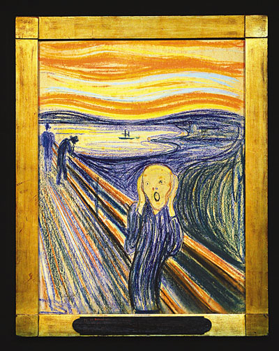 仔細比較4個版本後,可以清楚發現,由挪威船業鉅子奧爾森私人收藏的粉彩版本,色彩最為鮮明,紅色夕陽的張力,畫中主角掩耳張口的痛苦表情,讓人感受到蒙克當時內心的焦慮與不安。另一個重要之處是畫作的原畫框底,有蒙克本人所寫的詩,描述他創作的靈感。■英國《金融時報》/中央社