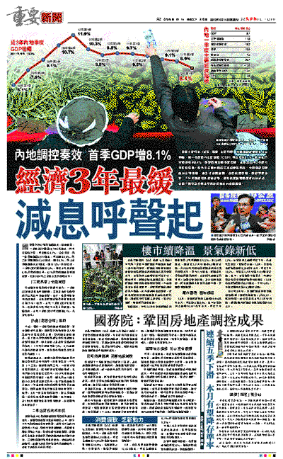 不過,對於一季度經濟增速明顯放緩,官方態度並不悲觀。國家統計局新聞發言人盛來運昨日在記者會上稱,經濟增長速度回落,除了國內外經濟形勢變化導致需求增長放緩的因素外,很大程度上是政府主動調控的結果。「今年計劃目標是7.5%,8.1%速度不僅高於發展目標,且從世界範圍來看也是比較高速度。」