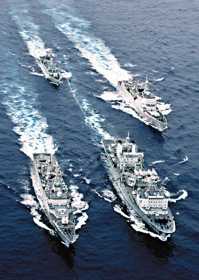 ■中俄海上聯合軍事演習將於22日舉行。圖為中國海軍艦艇編隊。