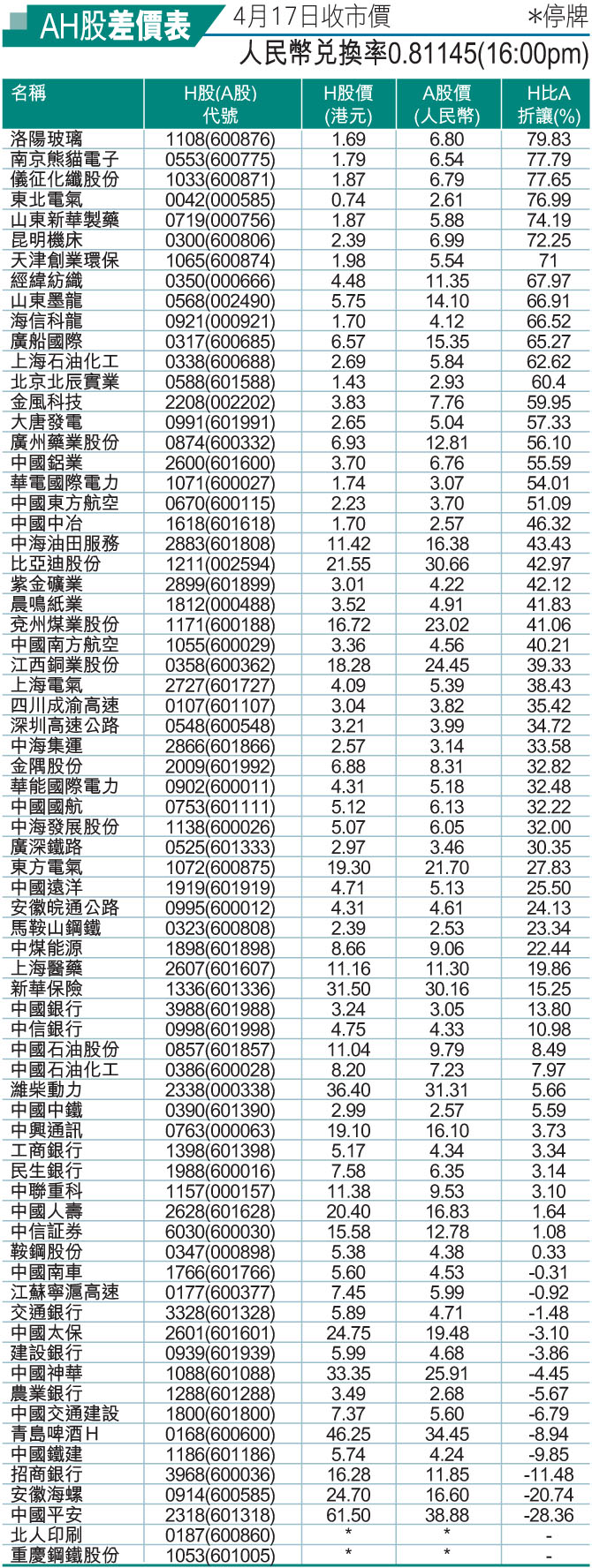 AH股差價表(4月17日收市價)*停牌 (2012-04-18) (圖)