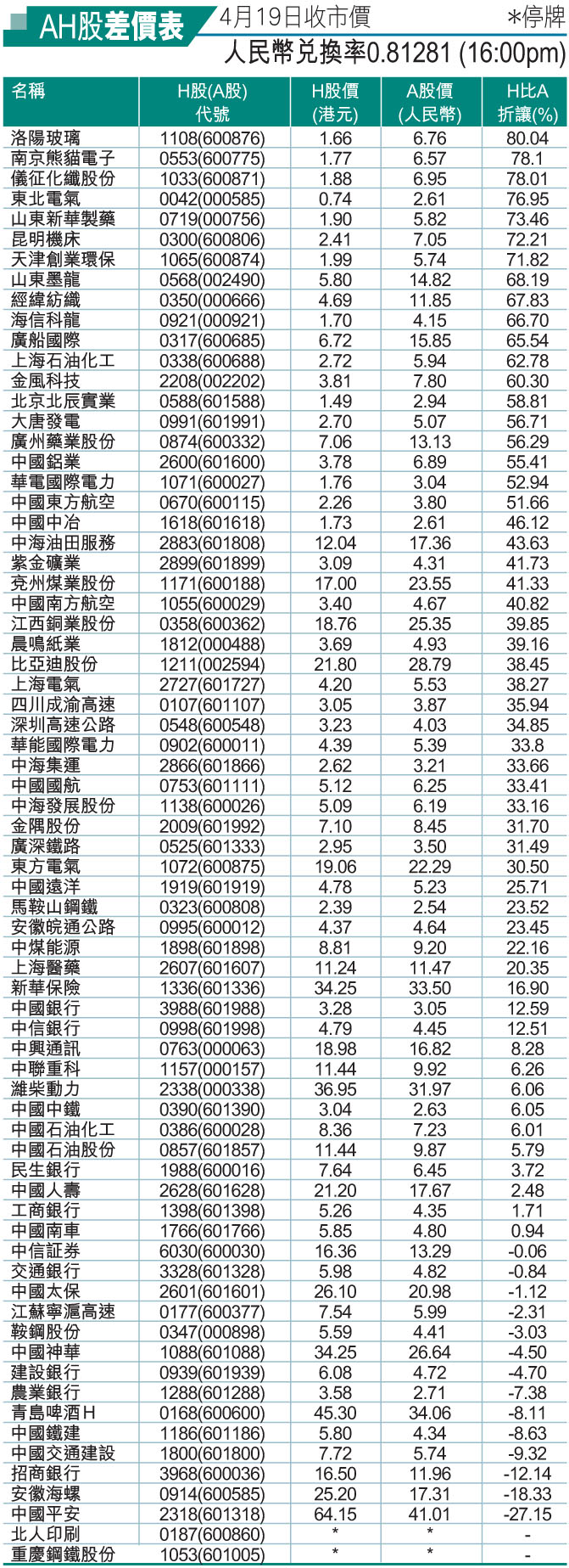 AH股差價表(4月19日收市價)*停牌 (2012-04-20) (圖)