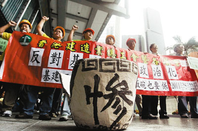 ■香港建造業總工會40名代表早前遊行到政府總部,指港珠澳大橋環評司法覆核影響基建工程和社會發展,支持政府上訴。 資料圖片