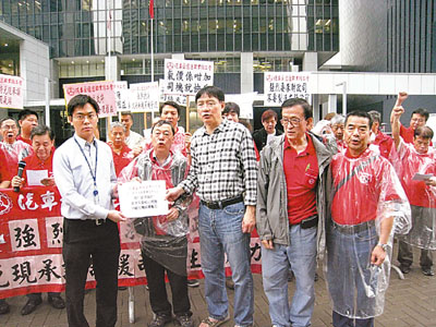 ■王國興(中)聯同10多名汽車交通運輸業總工會代表,到候任行政長官辦公室外抗議,希望當局減輕小巴營運壓力。