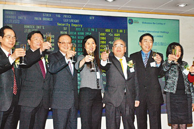 ■洪良2009年底在港上市,圖為管理層祝酒。資料圖片
