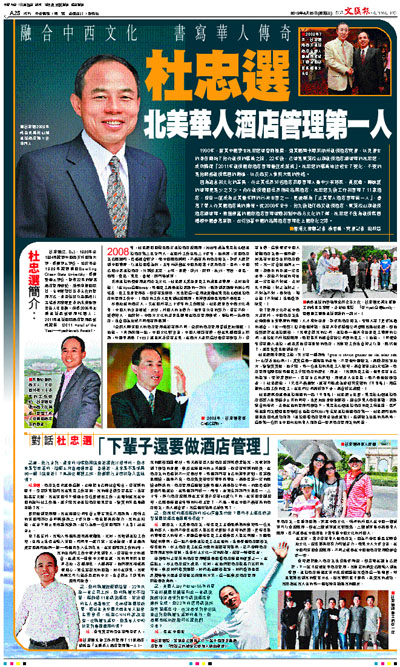 因為語言和文化的差異,在北美世界知名酒店高層管理人員中少有移民,黃皮膚、黑頭髮的經理更是少之又少。而在凱悅這個世界頂級品牌酒店,杜忠選先後工作和管理了11家酒店,並且一度成為北美最年輕的行政主管之一,更被稱為「北美華人酒店管理第一人」,書寫了華人在美國酒店業的傳奇。從2008年至今,他先後擔任西安凱悅酒店、東莞松山湖凱悅酒店總經理。憑借豐富的國際酒店管理經驗和對中西方文化的了解,杜忠選不僅為凱悅集團植根中國書寫新篇,也引領著中國的品牌酒店管理走上國際化之路。 ■香港文匯報記者 熊君慧、實習記者 田秋霞