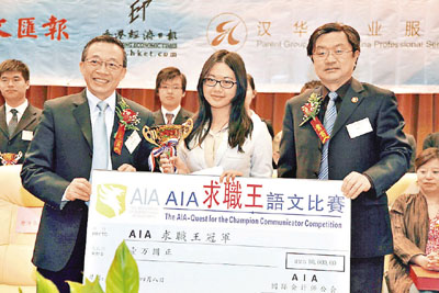 香港文匯報訊 由國際會計師公會(AIA)主辦的AIA「求職王」語文比賽2012年決賽,今年移師北京,日前在中央財經大學舉行。來自北京、上海、廣州、香港等城市的大學的18位參賽者,經過一番龍爭虎鬥,最後由香港浸會大學的陳璁同學脫穎而出,勇奪全場總冠軍,成為「求職王」。而明年AIA「求職王」語文比賽決賽將於廣州舉行。
