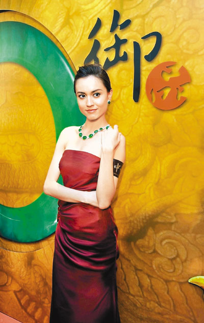 名模Mandy Lieu演繹的18K白色黃金鑲鑽石天然翡翠蛋面套裝,包括天然翡翠項鏈、戒指及耳環,翡翠顏色為純正明亮的翠綠色,色調一致,晶瑩剔透,質地溫潤無暇,設計大方精巧,實為一套極具美感和收藏價值的殿堂級翡翠首飾,首飾套裝價值二億三千五百萬港元。