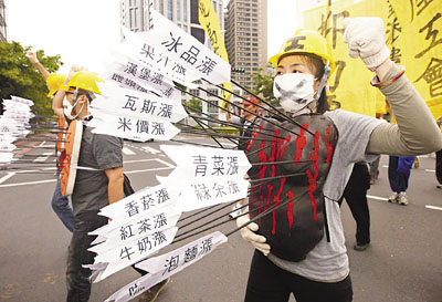 島內多個勞工團體29日號召了上千人,在新北市發起五一大遊行,強調「反貧窮要生存」訴求,凸顯油電將雙漲下,勞工生存不易的困境。他們除了高喊口號,現場還演出勞工被飆漲的油價、電費、學費萬箭穿心的行動劇,希望政府能聽到基層勞工的訴求。還有手持掃帚、廚餘桶、資源回收物的臨時清潔隊員,要求轉為正職人員、同工同酬。 ■中央社