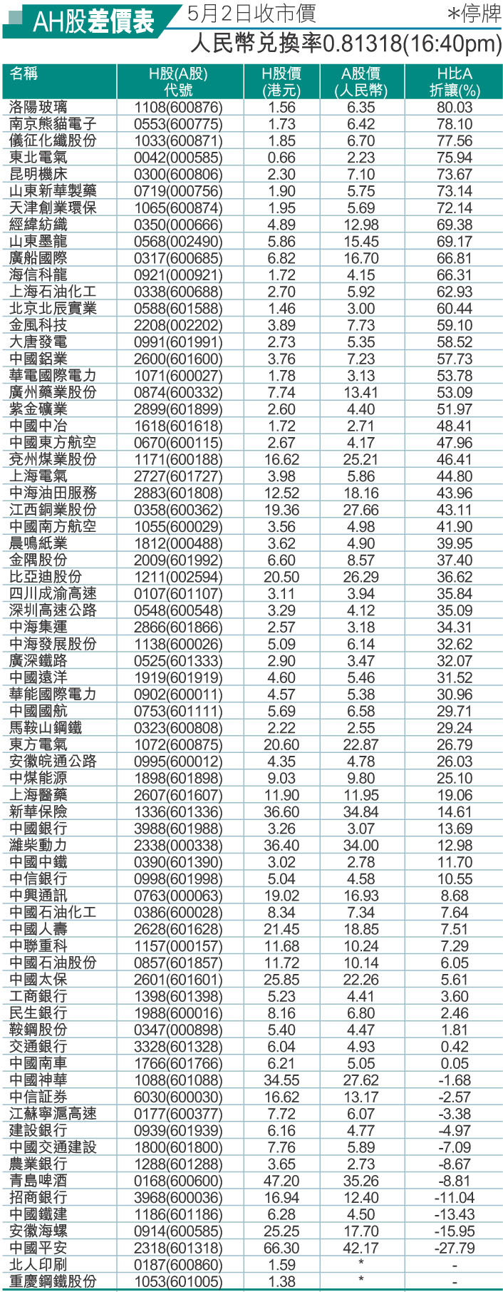 AH股差價表(5月2日收市價)*停牌