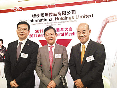 ■特步首席財務官兼執行董事何睿博(左),主席兼行政總裁丁水波(中),非執行董事陳偉成。香港文匯報記者劉璇 攝