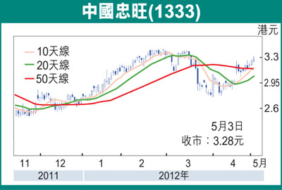 忠旺於4月19日發出盈喜,預期3月底止三個月純利,將按年大幅增加,主要是期內銷售收益大幅增加所致。受相關盈喜消息刺激,該股於翌日出現「裂口」走高的行情,而日前公布的業績對辦,續有利支持股價走強,其股價昨曾高見3.32元,造出自3月19日以來的高位,收報3.28元,升0.03元或0.92%,但仍為這其間的收市高位。