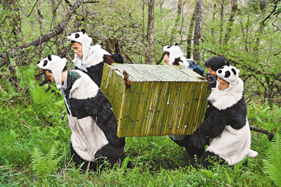 3日上午,在中國保護大熊貓研究中心臥龍核桃坪野化培訓基地,研究中心工作人員穿上特製的熊貓服,將全球首隻在野化培訓基地出生的大熊貓「淘淘」及其母親「草草」引到二期野化培訓場門口裝籠的區域。為了避免危險,工作人員放棄了麻醉「淘淘」的方案,用鮮竹筍分別將牠們引誘進了各自的籠子。隨後,在工作人員和武警協助下,母仔倆被順利轉移到附近的三期野化培訓圈。 ■中新網