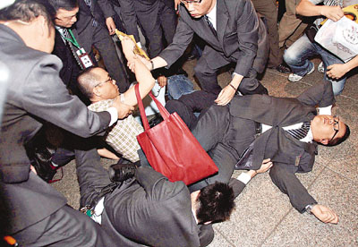 「中港家庭權益會」數十名代表,昨晨趁食物及衛生局局長周一嶽出席醫管局研討大會時,在場外抗議。他們高叫「BB要出世、媽媽無床位」等口號,不滿港人內地懷孕妻子,在本港公立醫院無預留分娩床位,又批評當局監管私院收費不力。期間有代表情緒高漲,一度想衝入會場內,與現場保安員發生推撞,至少一名代表、兩名保安員及一名攝影記者倒地。攝記混亂間被踢中頭部,召救護車入院治理,敷藥後無礙出院。■香港文匯報記者 聶曉輝