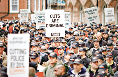 英國公共機構員工前日發動大罷工,抗議政府削減退休金,罷工持續24小時,參與人數達40萬,除公務員、醫護、教師及懲教人員外,英格蘭和威爾斯全部43支警察部隊中多達3.2萬名休班警員(英國法律禁止警員罷工)亦戴上黑帽,高舉標語遊行(見圖),指政府削減警員薪金和退休金是「有罪」。