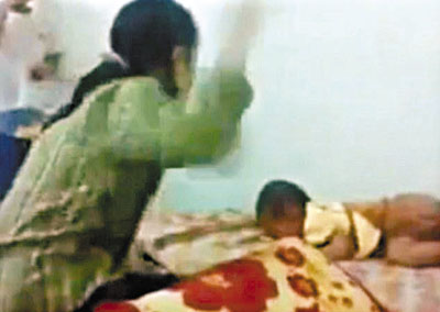 片長4分鐘,女嬰俯臥床角,哭得歇斯底里,狠母卻坐在床上用坐墊不停擊打女嬰頭部,又把手機擲向女嬰,之後捏女嬰的手和大腿,當女嬰嘗試抬頭又遭拍打。女嬰爬向狠母膝上,又遭推開。拍攝期間,一名男孩曾站在一角,邊吃邊看;拍攝者的聲音亦曾出現。有網民質疑為何當時沒人對女嬰施以援手。