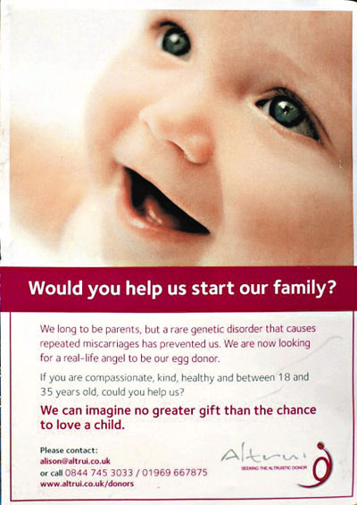 「如果你熱心、仁慈、健康,年齡介乎18至35歲,可否幫幫我們?世上沒有比有機會愛護小孩更大的恩賜。」英國卵子中介公司Altrui近日在劍橋大學派發傳單,以750英鎊(約9,359港元)誘使女生「捐卵」,聲稱求助夫婦也是校友,因罕見基因紊亂導致多次流產,無法生育。此舉惹來批評,指中介是向財困女大學生打主意。