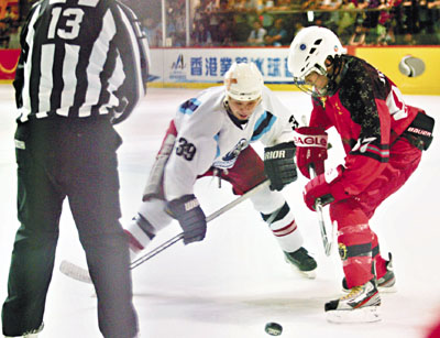 MegaBox 5人冰球賽12日圓滿結束,代表香港的高級隊(紅衫)在加時階段以2:0擊敗曼谷,捧得金盃。 ■香港文匯報記者黃舒慧 攝