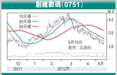 港股昨日結束8連跌,不過反彈的力度就依然欠勁,投資者對外圍市況存有戒心,都令到市況變得波動。在昨日反彈市中,部分板塊的個股彈力則頗見強橫,就以創維數據(0751)為例,便見愈升愈有,並以近高位的3.28元報收,大升0.36元或12.33%,成交也顯增至9,318萬元。經過昨日的急升,創維已一口氣收復10天(3.1元)及20天(3.23元)平均線,但離50天線(3.66元)則尚有距離,惟觀乎買盤似漸埋位,料其短期回升空間仍可望擴大,故值得繼續留意。