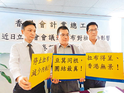 香港會計業總工會於本月14日,成功訪問了289名會員,了解他們對於立法會持續的拉布戰的意見。會長陳慶生昨日在記者會上強調,會計界向來屬沉默一群,但今次拉布事件令人覺得已到「不能不發聲」的地步。他指,綜觀過去10年,香港已經花了很多時間於內耗上,鄰近地區,如新加坡近2年間的國民生產總值從落後於香港到超越香港,甚至澳門及內蒙的國民生產總值都超過香港,內地一些大城市拋離香港的情況更甚,故香港再不能將時間糾纏於內耗之中。