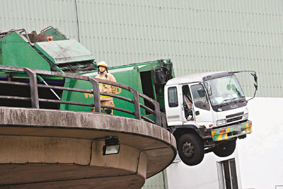 香港文匯報訊 (記者 劉友光) 昂船洲西九龍垃圾轉運站昨晨8時許發生驚險意外,一輛重型垃圾車在該站2樓卸完垃圾離開時,疑跟車工人忘將車尾揭背式巨型尾蓋降下,致撞及通道出入口標示車輛高度限制的「門楣」,令垃圾車車頭翹起擺動,然後失控撞毀通道天橋鐵欄後車頭懸空,險墮落10米下橋底,幸司機僅輕傷送院。受事件影響,轉運站服務受阻4小時。警方正調查意外原因。受傷垃圾車司機姓吳、52歲,肩部被安全帶勒傷,而跟車工人則無恙。據吳表示,開關巨型尾蓋的工作由跟車工友負責,由於其入職不久,疑因「生手」出事。另有同行工友表示,跟車工人大意忘記降下車尾蓋的事件每月平均有1至2宗,惟釀成如昨日般嚴重事故尚屬首次。