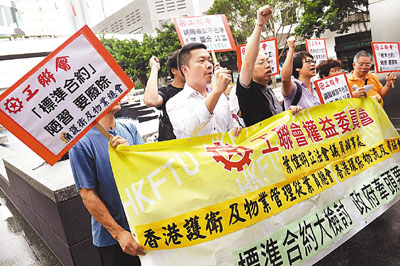 ■工聯會代表昨遊行至勞工處總部,要求勞工處處長卓永興直接與工會代表及員工會面。