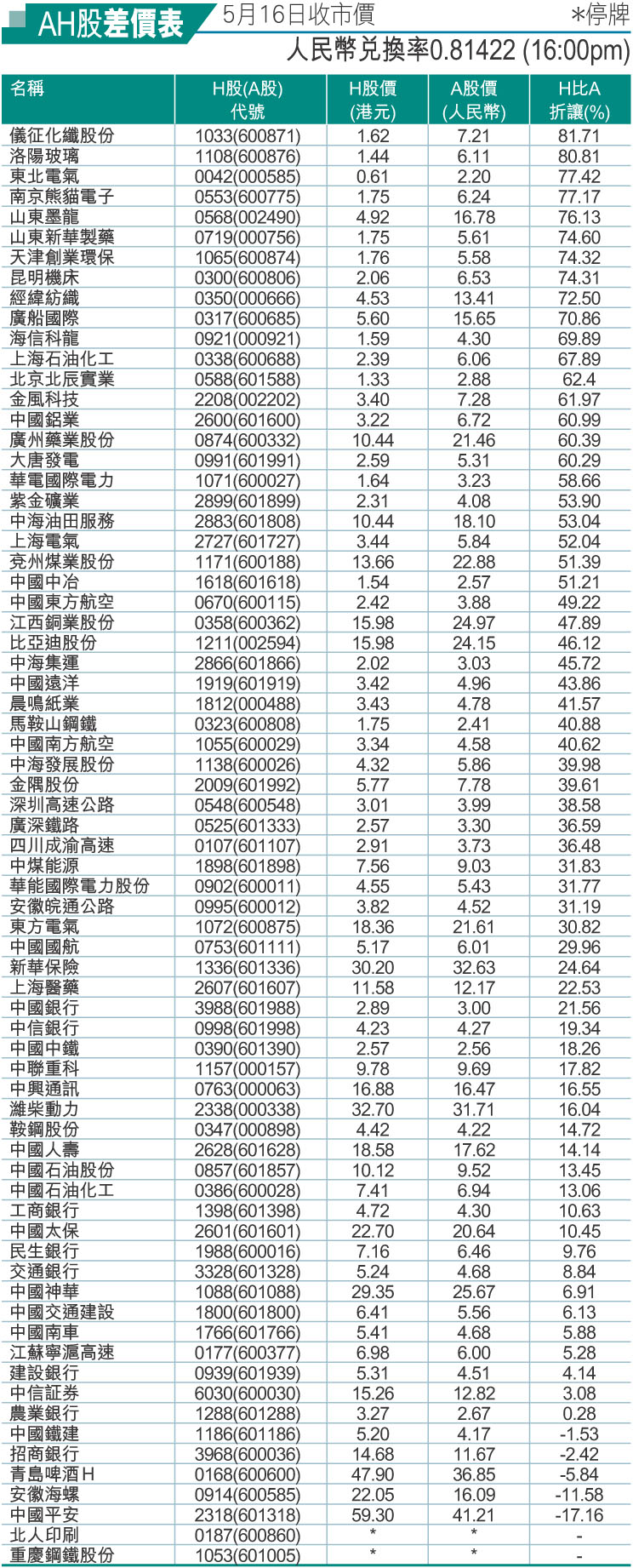 AH股差價表(5月16日收市價)*停牌 (圖)