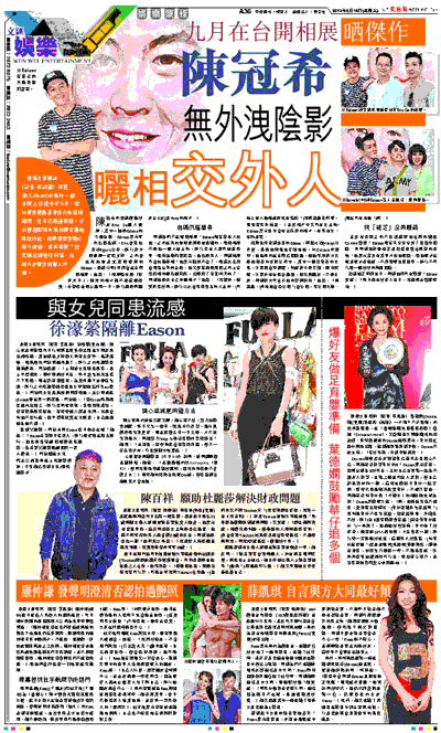 陳冠希前晚到觀塘好友Eric So個人畫展,其中一幅是Edison的大頭肖像。Edison表示年前出國語碟,Eric曾幫他設計figure公仔,所以對方開畫展一定來支持。之前曾在新加坡及北京開畫展的Edison,透露今年9月將會在台灣開相展,他說:「相展題材是『世界末日』,但我的相片都不是這個感覺,希望盡量開心過每一日,所以都是同朋友去BBQ及Party的相片。」