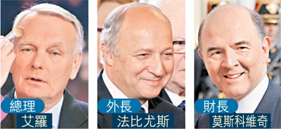 法國新內閣出爐!主要部長人選由社會黨員及總統奧朗德的長期戰友出任,被外界形容為溫和派內閣。除「德國通」總理艾羅外,財長由54歲的歐洲事務專家莫斯科維奇出任,外長則由65歲政壇老手、前總統密特朗任內總理法比尤斯出任,他在大選期間代表奧朗德訪問北京,建立關係,並與奧朗德理念一致,認為應改變前總統薩科齊的親美政策。