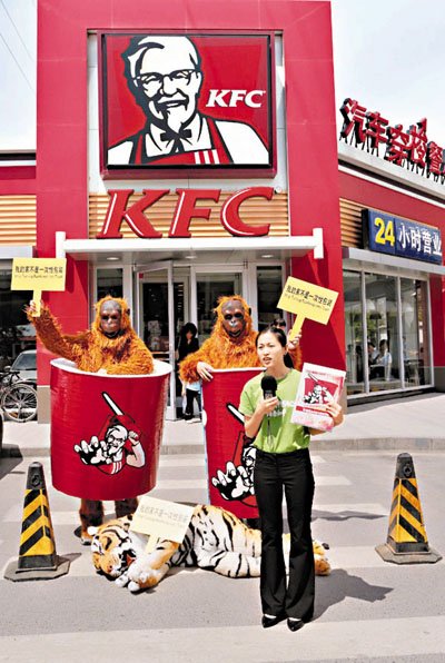綠色和平森林保護項目主任楊婕指出,肯德基「全家桶」的材料來自印尼熱帶雨林,那裡正是紅猩猩和蘇門答臘虎等瀕危動物的棲息地,而據調查,紅猩猩當前已是極度瀕危物種,蘇門答臘虎亦僅存400隻左右。楊婕認為,肯德基破壞熱帶雨林的行為,進一步將這些動物推向滅絕的邊緣。