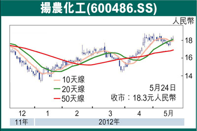 揚農化工(600486.SS)2012年近90%的利潤可能來自殺蟲劑業務,因而有望最大程度上受益於年初至今全球強勁的殺蟲劑需求。隨著菊酯殺蟲劑的價格和銷量從2011年低點回升以及草甘膦除草劑利潤率企穩,我們認為揚農化工有望在2012-2014年實現20%的盈利年均複合增幅。我們的2012-13年盈利預測較萬得市場預測高6%和2%。儘管回報高於歷史均值,但該股市盈率和市淨率較歷史均值低1個標準差,估值具有吸引力。