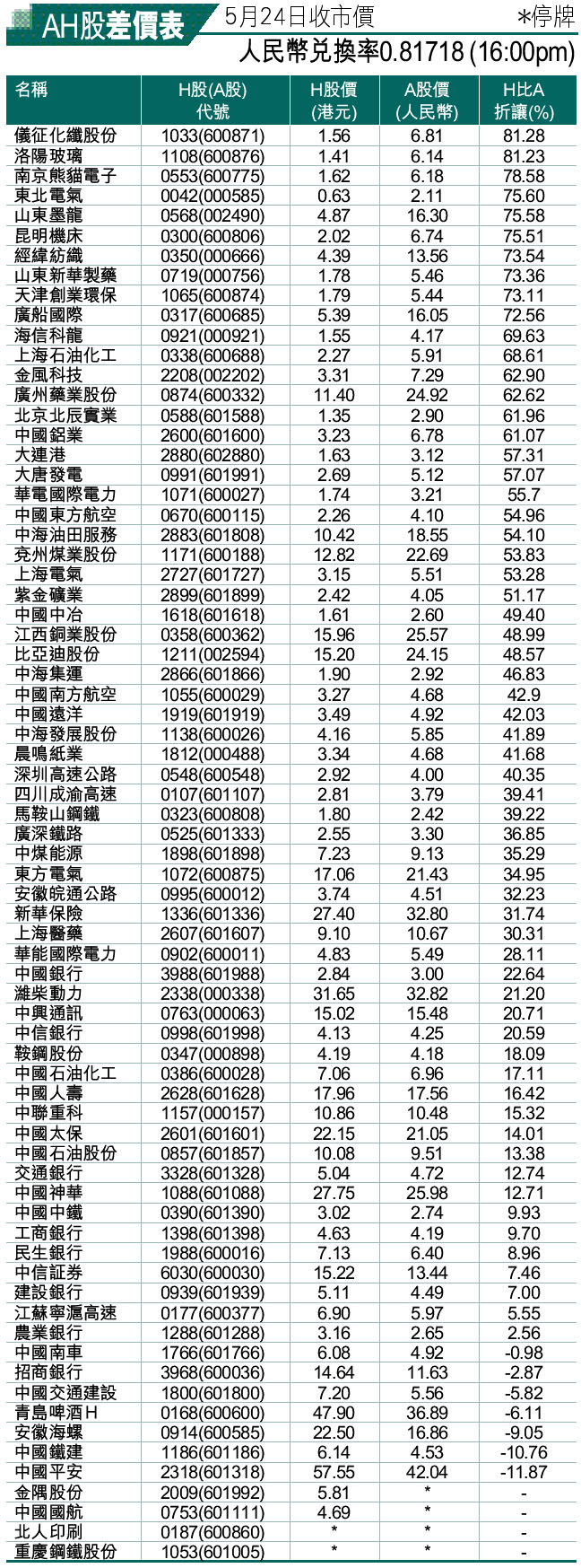 AH股差價表(5月23日收市價)*停牌 (2012-05-24) (圖)
