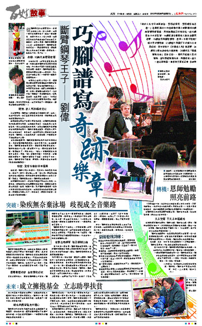 「我的人生中只有兩條路,要麼趕緊死,要麼精彩地活著。」這是獲得2011年度感動中國人物稱號的25歲無臂鋼琴師劉偉,用來勉勵自己的座右銘。他10歲因意外失去雙臂,14歲獲得全國殘疾人游泳錦標賽冠軍,19歲自學用腳彈鋼琴,僅用一年即可彈奏7級水平的鋼琴曲,23歲創下用腳打字的健力士世界紀錄,同年並摘下《中國達人秀》總冠軍,24歲登上維也納金色大廳演奏,25歲成立「劉偉擁抱基金」投身公益……雖然不能給人愛的擁抱,卻以堅毅抱擁生命,用腳譜寫一首又一首奇跡樂章。 ■香港文匯報記者 李茜婷