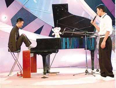 ■ 2008年,北京殘奧會大使劉德華到京參與錄製北京電視台的《唱響奧運》。失去雙臂的全國殘疾人運動會游泳冠軍劉偉為劉德華現場伴奏。資料圖片