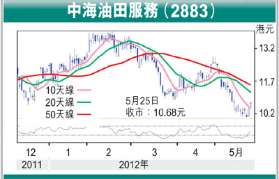 中海油服現價市盈率9.71倍,今年預測市盈率將降至7.5倍,處於吸引水平。該股近日在退至10元水平獲得支持,上周五再度收復10天平均線,技術走勢已有所改善,在股價仍處偏低水平伺機收集,上望目標為上月底阻力位的12.78元。