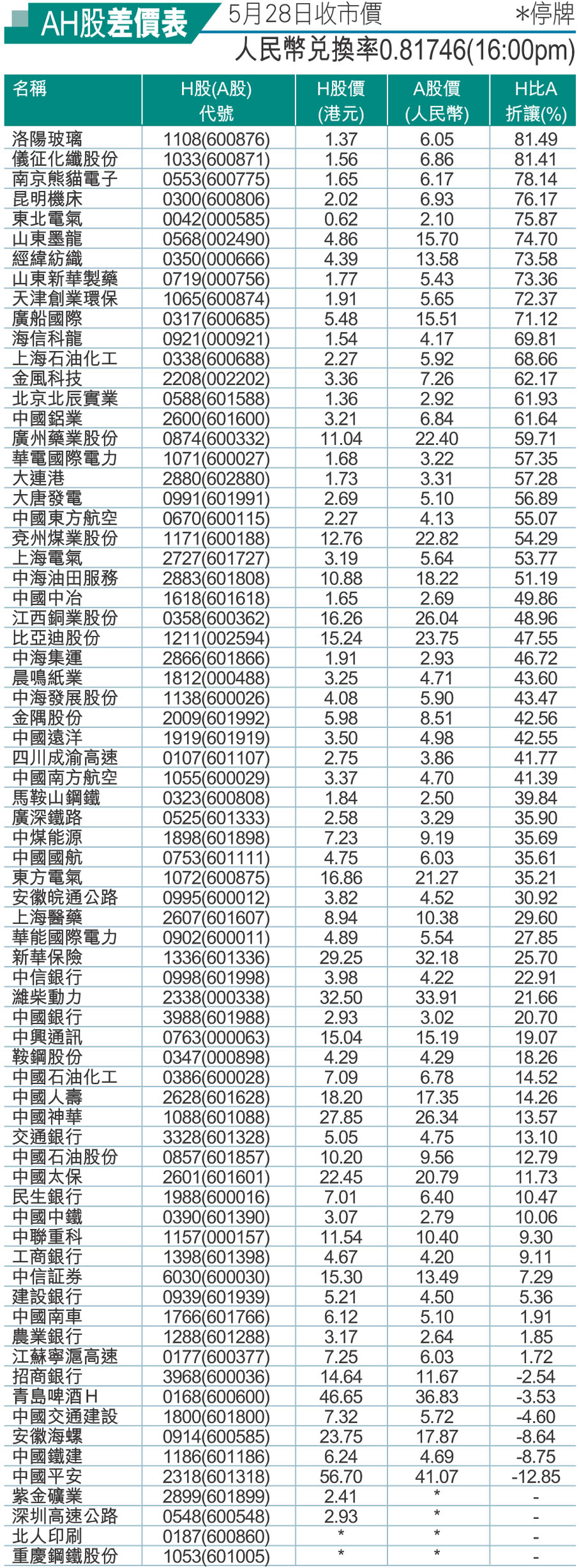 AH股差價表(5月28日收市價)*停牌 (2012-05-29) (圖)