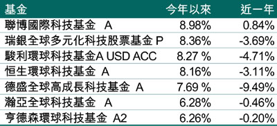 以佔今年來榜首的聯博國際科技基金為例,主要是透過將不少於80%總資產投資於從科技進展與改善中受益的多元化公司股票管理組合。上述基金在2009、2010和2011年表現分別為50.87%、17.71%及-4.1%;其平均市盈率和標準差為18.08倍及19.69%;而資產百分比為100% 股票。