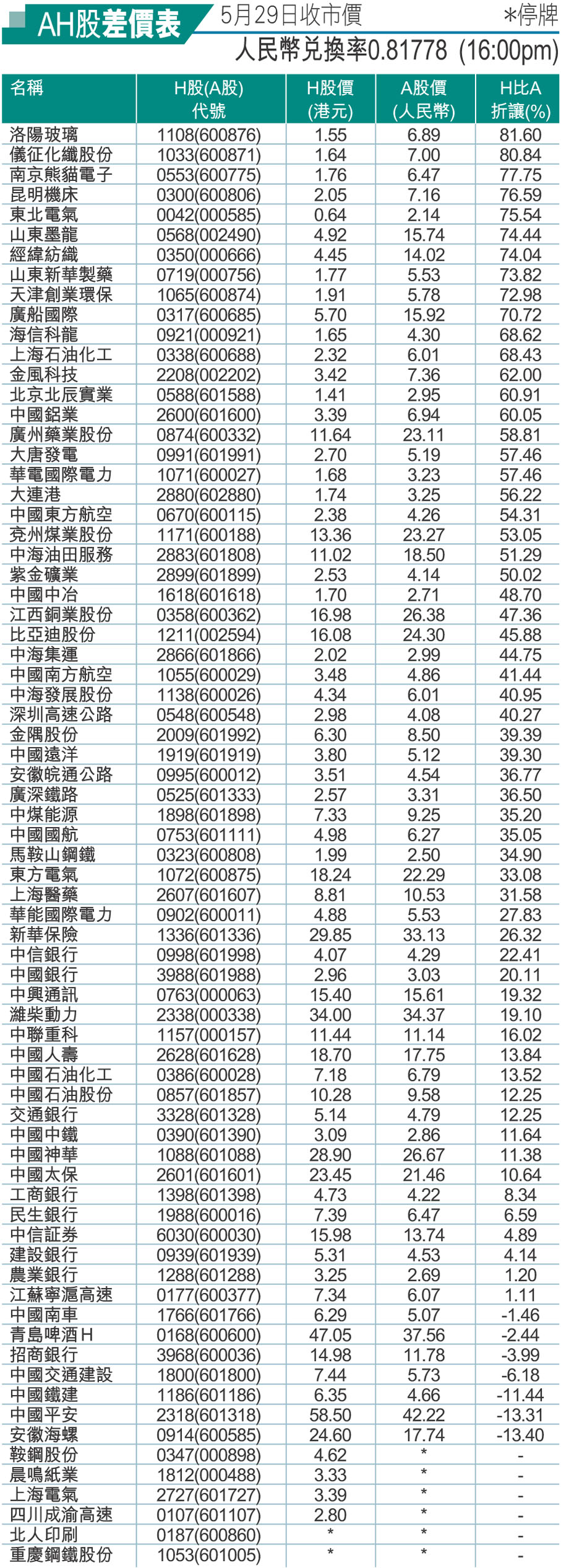 AH股差價表(5月29日收市價)*停牌 (2012-05-30) (圖)