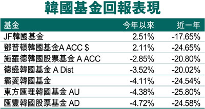 以佔今年來榜首的JF韓國基金為例,主要是透過韓國證交所或店頭市場的多元化公司股票組合,以達致長期資本增值目標。