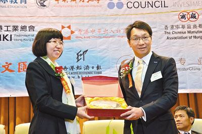 中央財經大學培訓學院李溦院長致送紀念品予國際會計師公會香港分會副會長陳毅生。