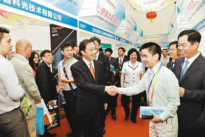 ■北京市委常委、統戰部部長牛有成在「2012僑商北京洽談會」與參展商交流。