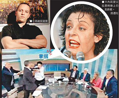 希臘國會重選將於本月17日舉行,各黨競選活動進入最後衝刺。極右「金色黎明黨」在上月選舉中獲7%選票而首度進入國會,但該黨發言人卡西迪阿里斯前日在一場直播電視辯論中公然動粗,先向一名左翼女政客潑水,再掌摑另一名挺身而出的共產黨女黨員;事後卡氏逃去無蹤,正被警方通緝。