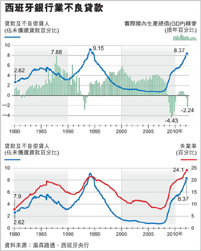 西班牙再遭降級!國際評級機構惠譽前日將西國主權信貸評級,由「A」連降3級至「BBB」,僅高於垃圾級2級,展望為負面。惠譽昨再降西國4個半自治區評級。歐盟消息稱,西國最快今日提出方案要求援助銀行業,歐元集團屆時將發聲明回應。不過,歐盟委員會稱沒收到求援消息,德國總理默克爾發言人則拒絕置評,重申一切由西國決定,並指歐洲已準備好支援措施。荷蘭財長亞赫表示,西國情勢危急,不排除歐元區財長會在周末商討拯救西國。